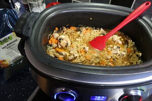 - Now add everything together into the slow cooker and cook on low for about six hours, adding extra hot water if it looks like it may need it.
