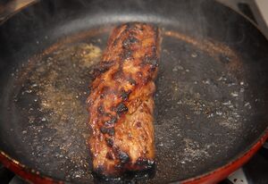 3. Heat the oil in a frying pan and brown the lamb. Think of it as shaped like a Toblerone bar and brown it on its three long sides. Cook for about 10 minutes in total, so that it is still pink in the middle.
