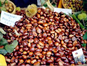 EVIDENCE OF ORIGIN: The cultivating of nut-bearing chestnut groves in the Mugello area may go back to Roman times; there is considerable documentation from the Middle Ages and later on testifying to the extent and importance of chestnut-growing, mentioning the marron chestnut in particular. Up until the end of the 1950s, the centuries-old nut-bearing chestnut groves in the area were an important and irreplaceable source of food and income for the local population, such that the chestnut was given the well-deserved name of "the tree of sustenance". After a 30-year period of steep decline, during which time there was a considerable depopulation of the mountain area, a change in diet and the appearance and spreading of chestnut canker which drastically reduced the area covered by chestnut groves, in the 1980s this sector began a great recovery, favoured by good market conditions for marron chestnuts and also by the realization that chestnut groves are not only a significant source of income but are also extremely important as a collective heritage from historic, environmental, scenic and tourist-recreational viewpoints. At the present time there are 3,322 hectares of nut-bearing chestnuts in the proposed area, and the marron chestnut production put on the market yearly ranges between 1,000 and 1,500 tonnes, to which should be added the retail sales directly from the farms and internal consumption; the average annual gross sellable product for the producer is estimated at approximately Lit. 7,000,000.
