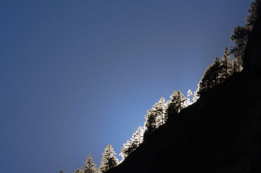 Swiss cliff-edge tree line illuminated by morning sun at Lauterbrunnen.