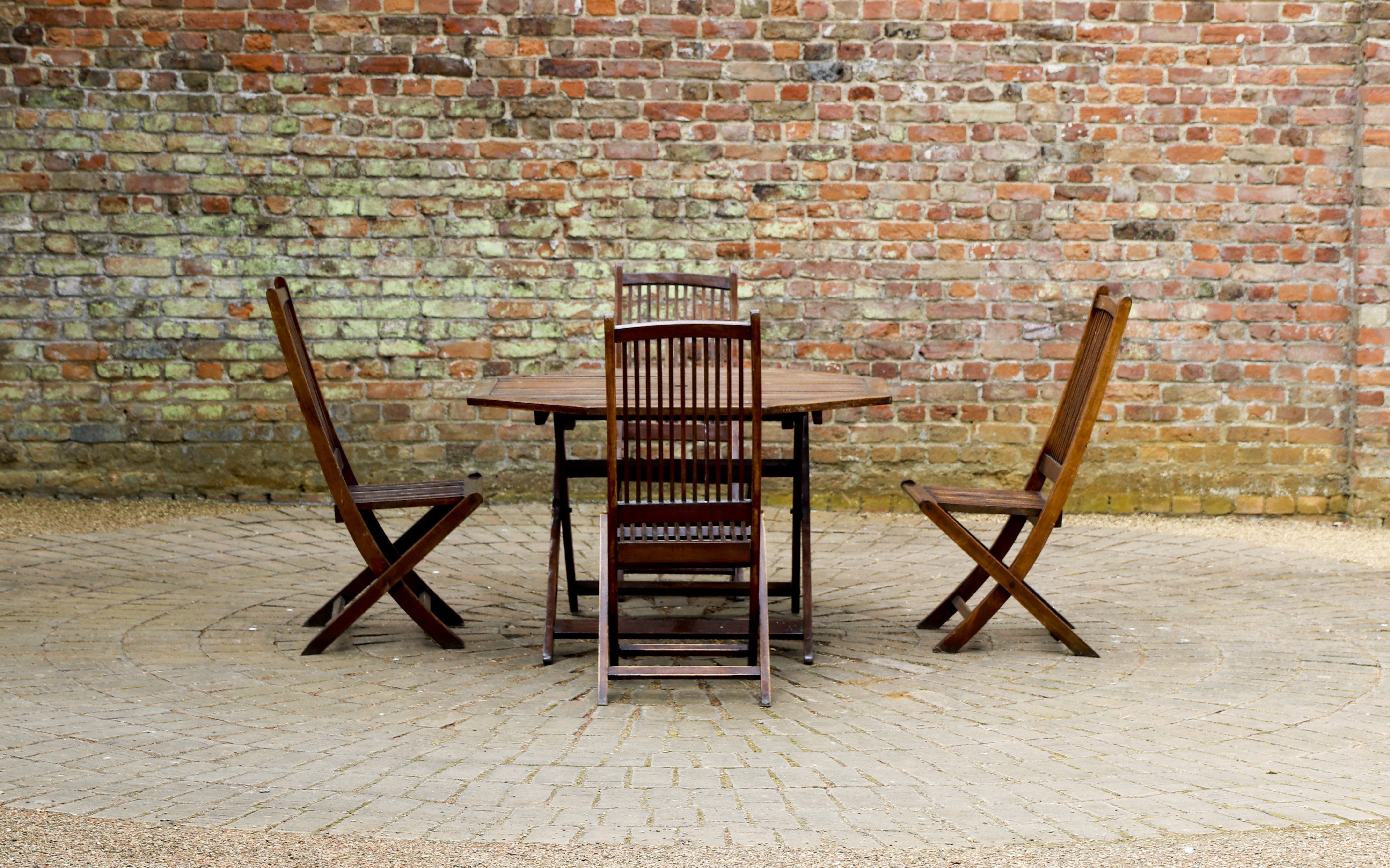 Table with four chairs, in front of a high brick wall in Elgoods Brewery Gardens