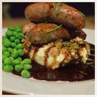 - Bacon steakburger and sausage bake with leek mash cambazola and tomatoes