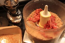 - Put a metal blade in the food processor and add the crispy pancetta and any of the oil left after the cooking.