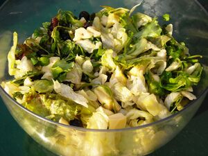 - 1 lettuce, washed, shredded and dried, or a large bag of mixed leaves