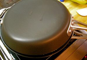 A frittata pan is specifically designed for cooking frittatas. It is a dual handled pan (usually nonstick) with a hinge that allows the pan to be opened or closed with a lid. The egg mixture is poured into the bottom portion and additional ingredients placed on top. After the bottom begins to cook the frittata is lifted slightly with a spatula so any additional egg rolls off the top and cooks on the bottom. This way the ingredients are only baked slightly into the top. Then the lid is closed and the frittata is cooked to the desired consistency, traditionally well done.