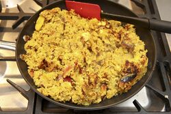 - Oil a large oven tray and spread the cooked mixture evenly and brown under the hot grill until it gets a little crunchy.